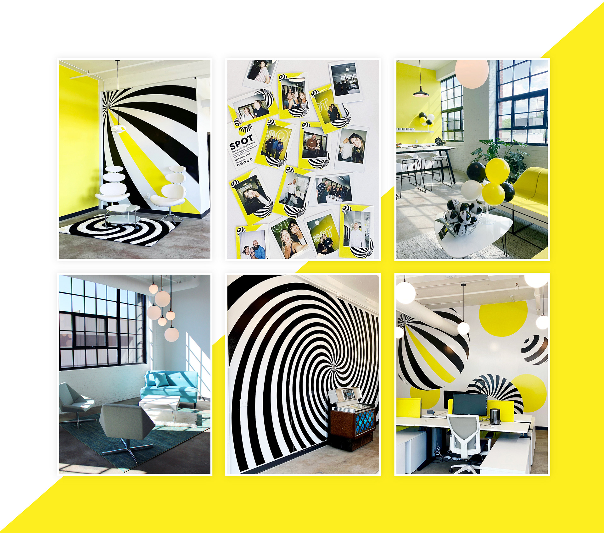 Spot is a creative agency based in Saint Paul, Minnesota that specializes in strategy, creative development, design and marketing. Before moving into a new office space in 2022, our team took this as an opportunity to rebrand the company to feel more modern, using eye-catching bright yellow graphics, playful striped "spots" and a refreshed sans serif logo. Our rebrand includes a new interactive website design, social media strategy, office space interior designed for hybrid use, promotional materials and more.