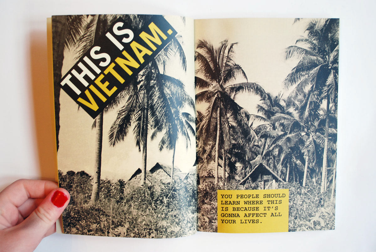 This is Vietnam is a typographic book inspired by an interview with two of my veteran uncles, John Price and Billy Voje, about their experiences fighting in the Vietnam War. From the interview, I pulled specific quotes and phrases that I felt strongly captured their stories, using bold graphic elements to visualize the chaos and intensity of the war.